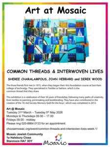 CDS Member Derek Wood is exhibiting with three friends at the Mosaic Jewish Community Synagogue, Stanmore until 5th May. Common Threads & Interwoven Lives will feature Printmaking, Textiles, Painting & Bookbinding. The featured artwork ‘Interwoven’ is a woven & stitched collage featuring  all 3 of our prints.