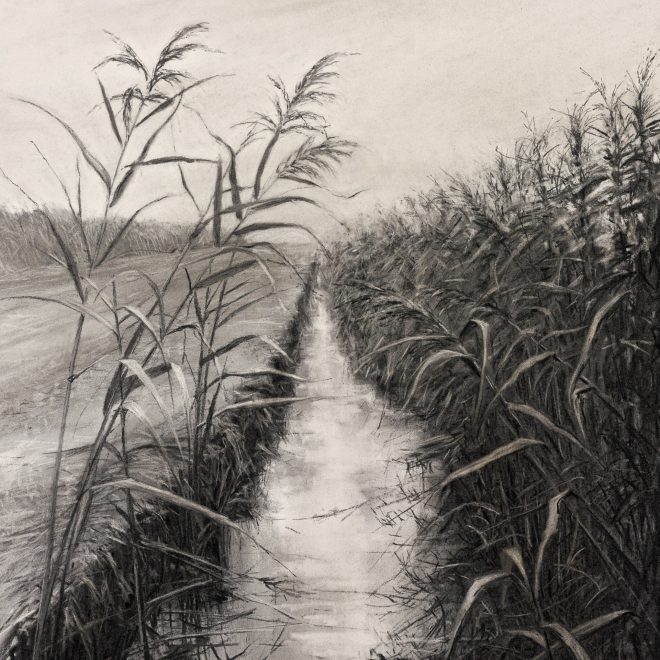 She has always loved drawing and works predominantly in charcoal – a medium which suits her interest in the patterns of light and shadow across the landscape. She enjoys the wide range of abstract mark-making that can be found with a single stick of charcoal.