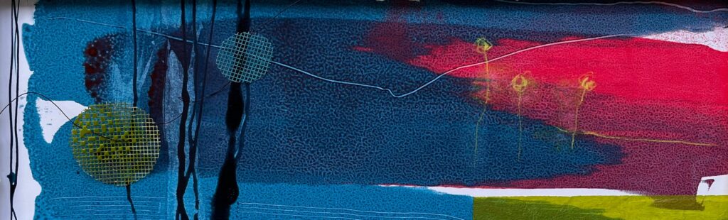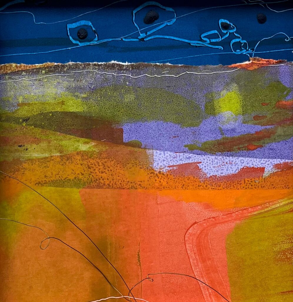 Central to her work are two fascinations. Firstly her love of colour manifests itself as exploration into colour groupings; how different combinations interact with each other, the effects of layering, texture and mark making – sometimes suspending translucent layers creating additional shades through light and shadow. Secondly, Hilary’s curiosity about different materials and processes drives her experimentation of combining artistic disciplines – discovering what can be achieved and how that might look in her work.