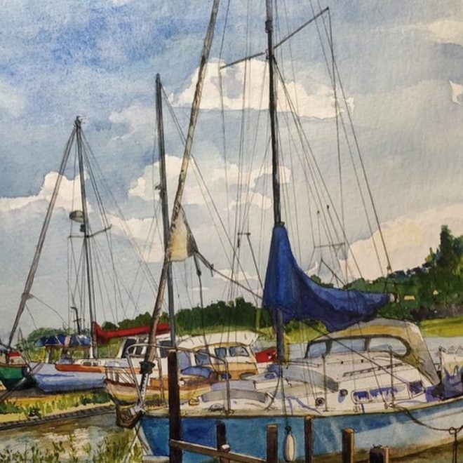 She prefers to paint with pen and watercolours, landscapes, her beautiful home town of Saffron Walden, animal portraits and flowers. She also creates collages where writings, quotes and music all reflect the subject matter.